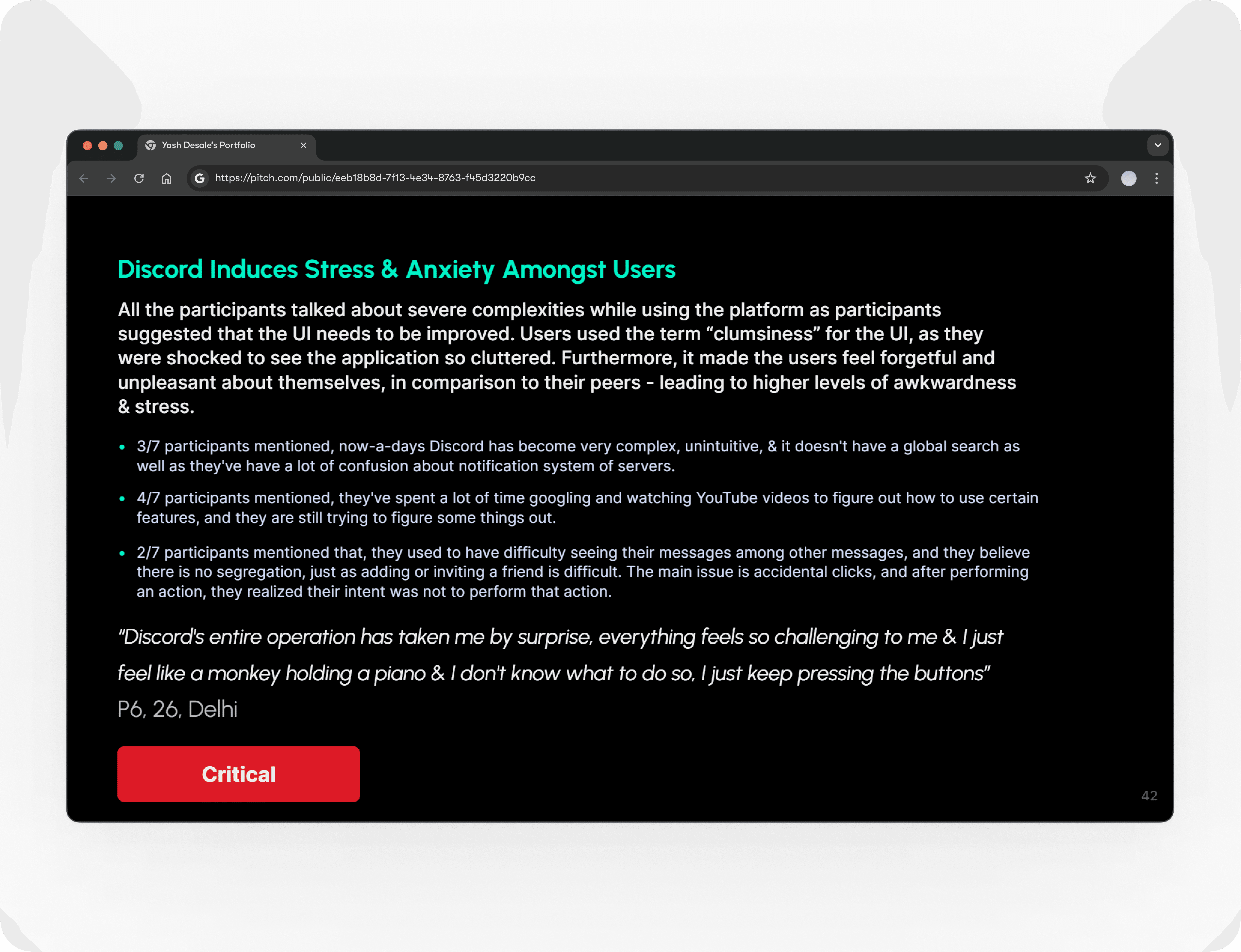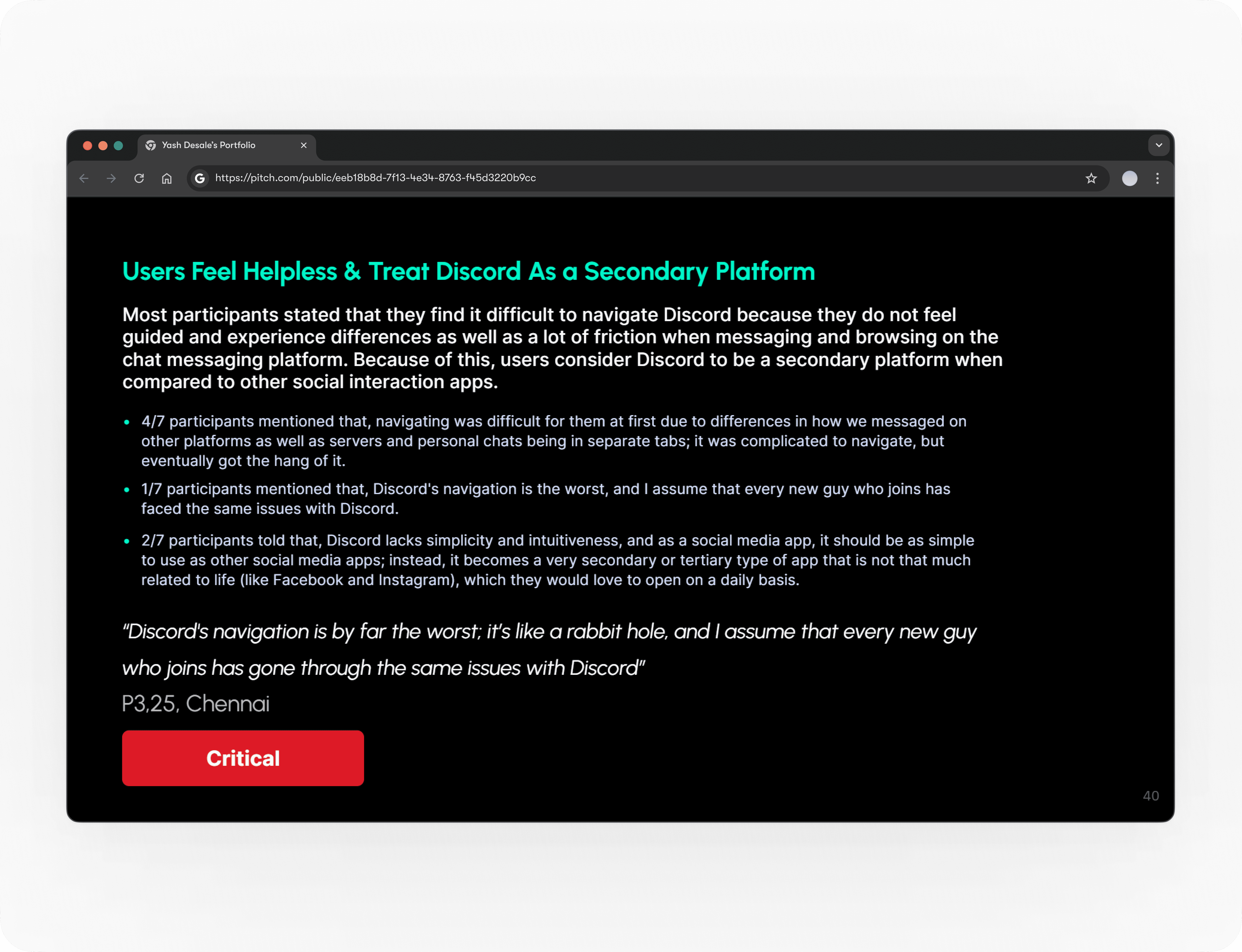 A strategic research initiative at making Discord more accessible beyond the gaming community. Through behavioral research and interactions with over 12 users and community builders, I uncovered the emotional barriers blocking mainstream adoption and proposed solutions that address motivation, and ease the learning curve.